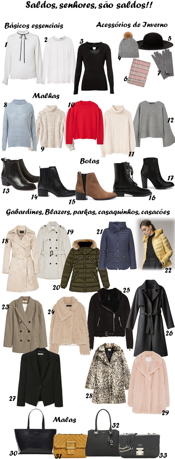 1- Blusa Lanidor (aqui) // 2- Blusa Lanidor (aqui) // 3- Camisola Lanidor (aqui) // 4- Gorro Lanidor (aqui) // 5- Chapéu Lanidor (aqui) // 6- Cachecol Zara (aqui) // 7- Luvas Lanidor (aqui) // 8- Camisola Lanidor (aqui) // 9- Camisola La Redoute (aqui) // 10- Camisola Mango (aqui) // 11- Camisola Mango (aqui) // 12- Camisola Mango (aqui) // 13- Botins Lanidor (aqui) // 14- Botas Pepe Jeans (aqui) // 15- Botas Pepe Jeans (aqui) // 16- Botas Zara (aqui) // 17- Botins Salsa (aqui) // 18 - Gabardina Lanidor (aqui) // 19- Trench-coat Zara (aqui) // 20- Casaco Zara (aqui) // 21- Parka Lanidor (aqui) // 22- Casaco Massimo Dutti (aqui) // 23- Blazer H&M (aqui) // 24- Casaco Zara (aqui) // 25- Blusão Biker Zara (aqui) // 26- Casaco La Redoute (aqui) // 27- Blazer Mango (aqui) // 28- Casaco H&M (aqui) 29- Casaco Zara (aqui) // 30- Mala Massimo Dutti (aqui) // 31- Mala Uterqüe (aqui) // 32- Mala Guess (aqui) // 33- Mala Guess (aqui)